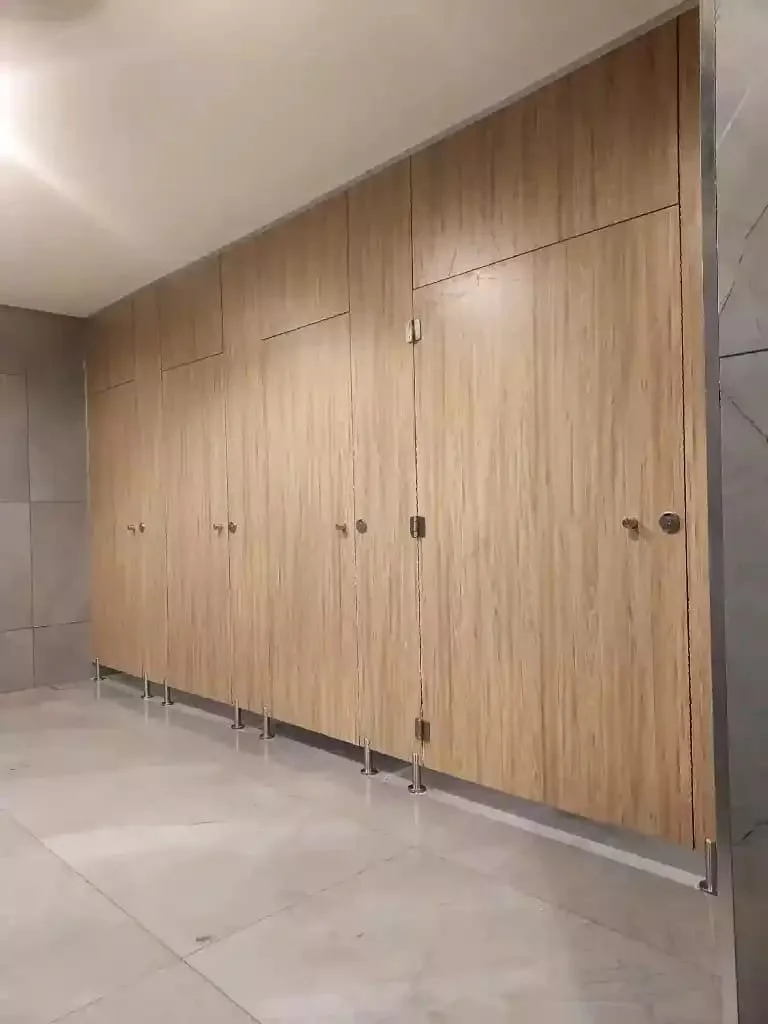 Restroom with wooden stall doors and tiled flooring, brightly lit environment.
