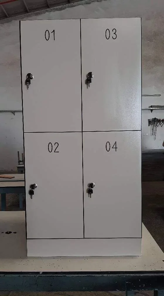 Metal locker labeled "01" with a lock, on a marble table, surrounded by office furniture.