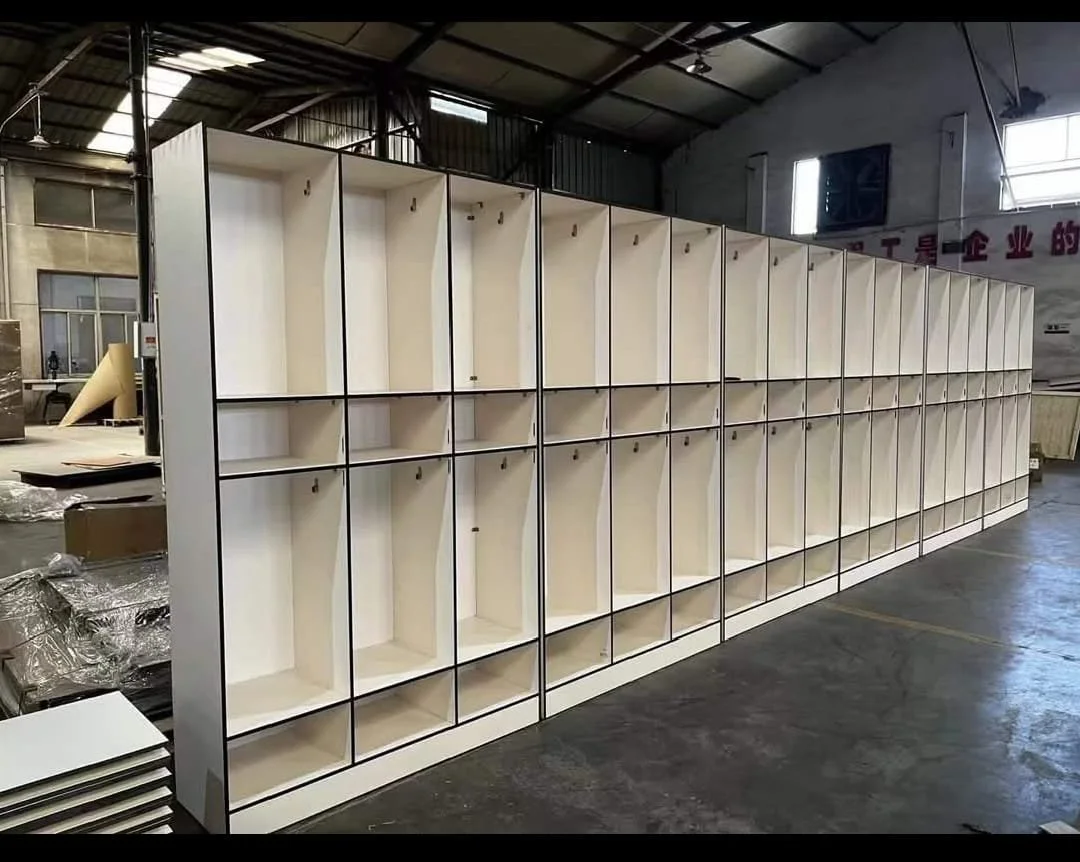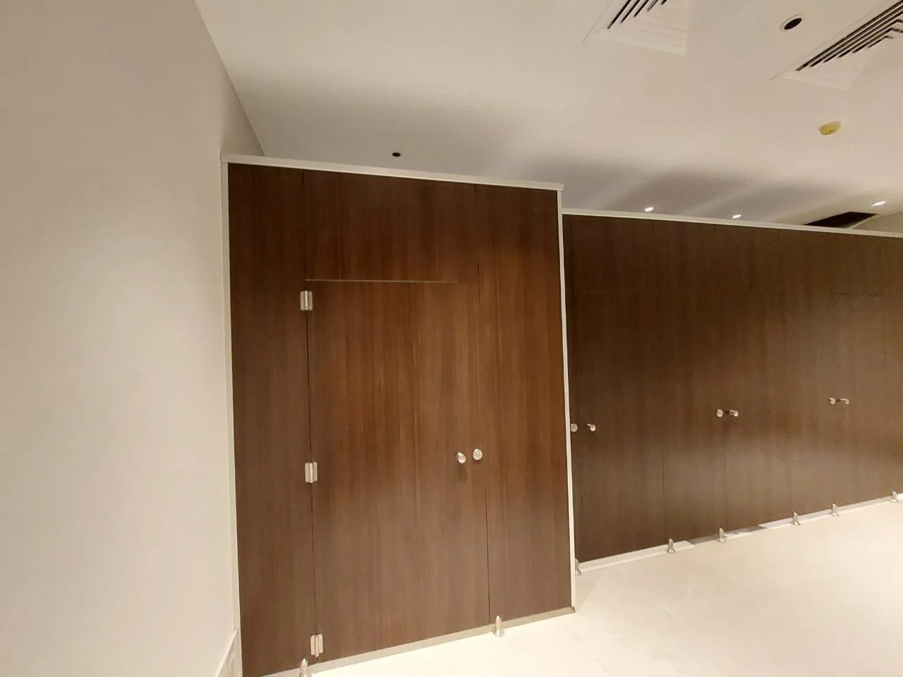 Row of tall lockers in a locker room with benches in front, white and brown color scheme, folded towels on the bench.