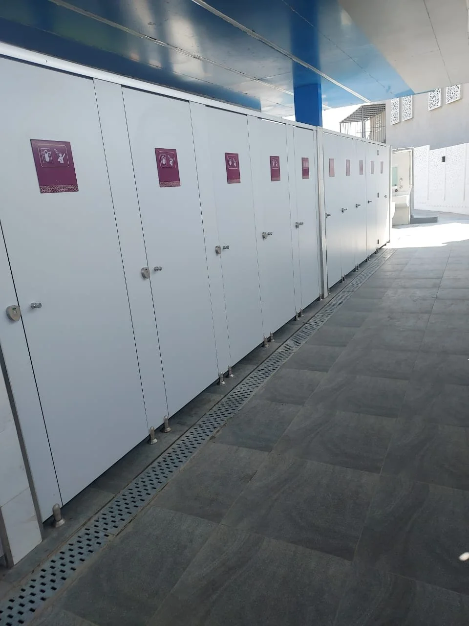 Row of white bathroom stalls with closed doors and signs on each, located in a tiled public restroom area.