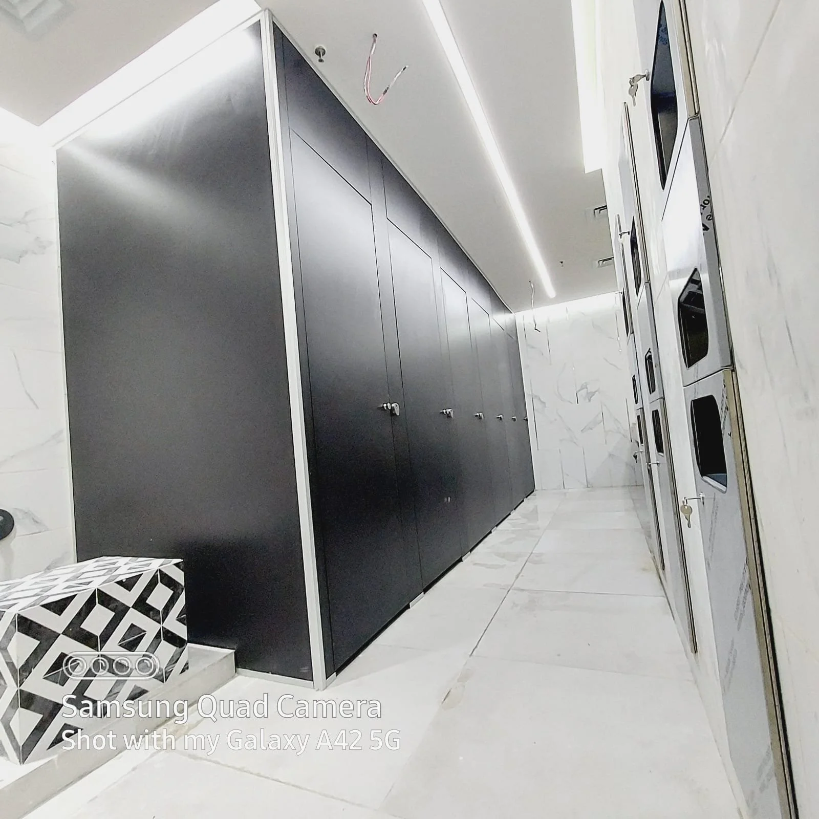 Modern public restroom with black stall doors and white tiled walls, featuring LED lighting and geometric black and white patterned object on steps.