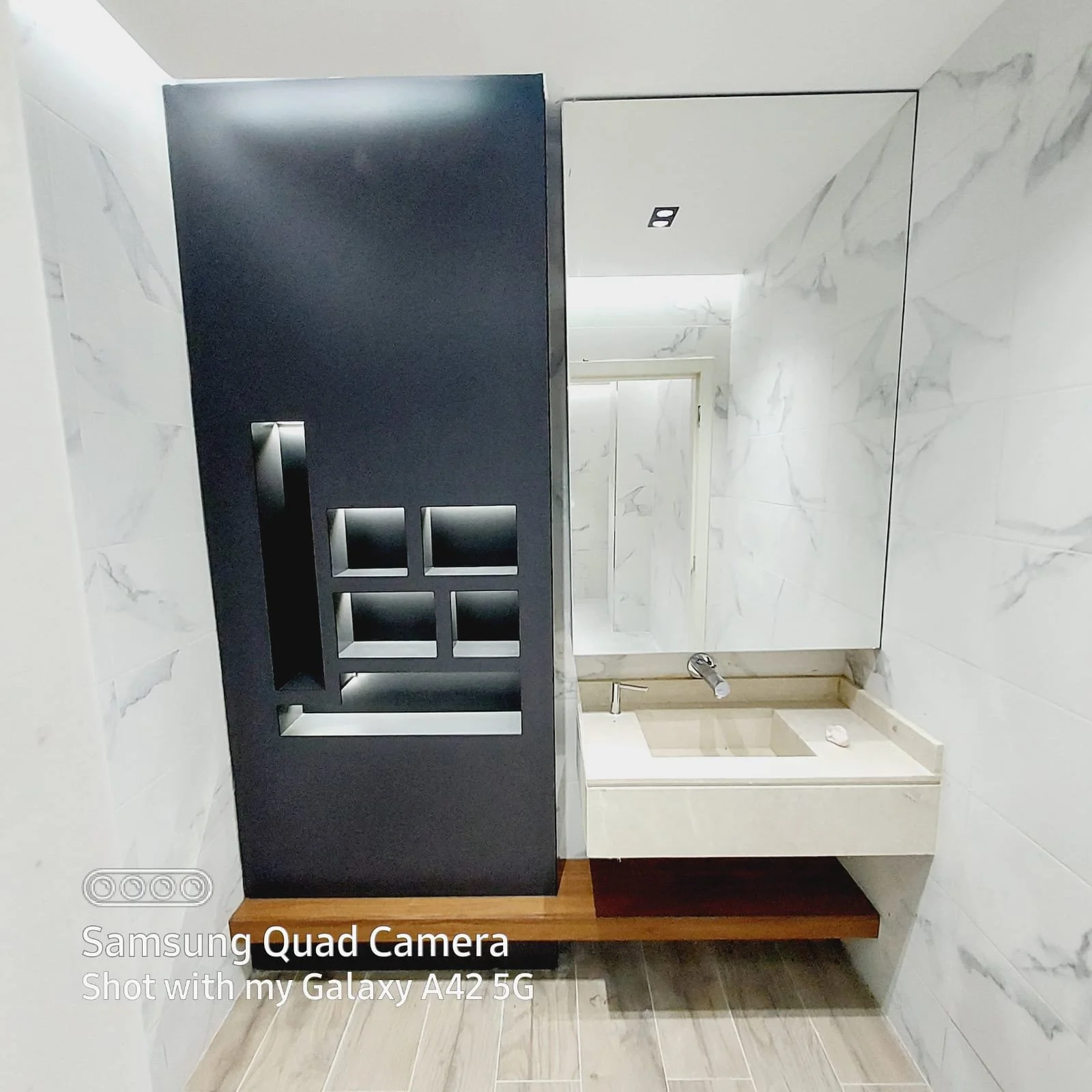 Modern bathroom with marble tiles, a wall-mounted black cabinet, a large mirror, and a rectangular sink on a wooden shelf.