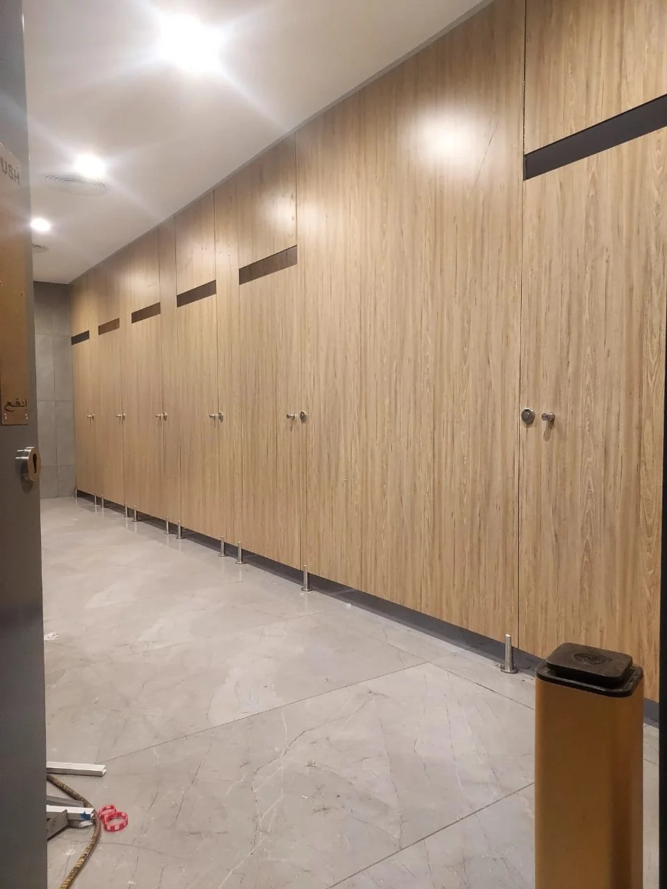 A row of wooden bathroom stalls with polished tile floor and recessed ceiling lights.