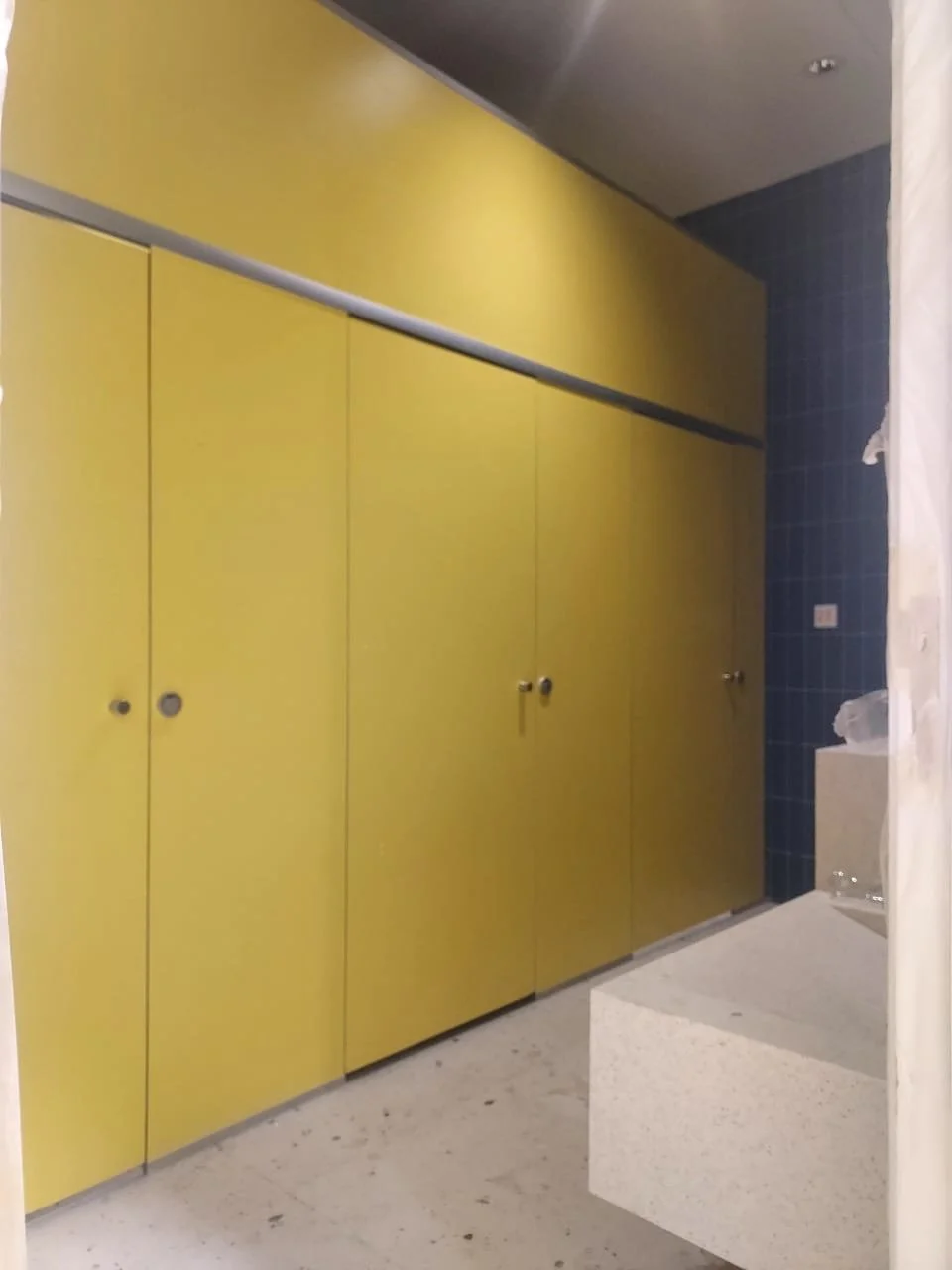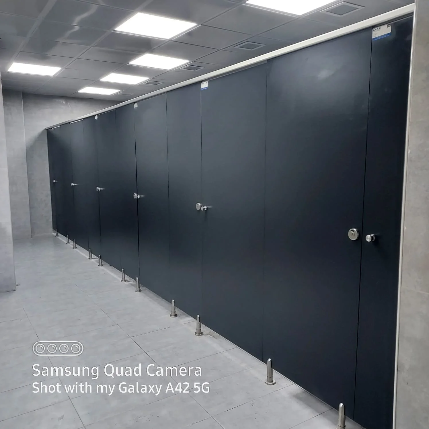 Row of gray restroom stalls in a public bathroom with tiled floor and ceiling lights.